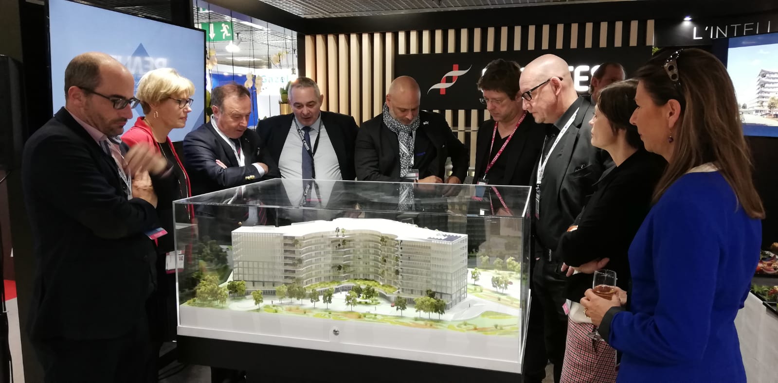 Cocktail en présence de Yoann CHOIN-JOUBERT pour la présentation de la maquette d’ASTER, le projet de 25 000 m² de bureaux à Montigny-le-Bretonneux (78). Par Valérie FAUVEL, Directrice de Région Île-de-France, REALITES PROMOTION et Eric PISTRE, Directeur de Région Adjoint.