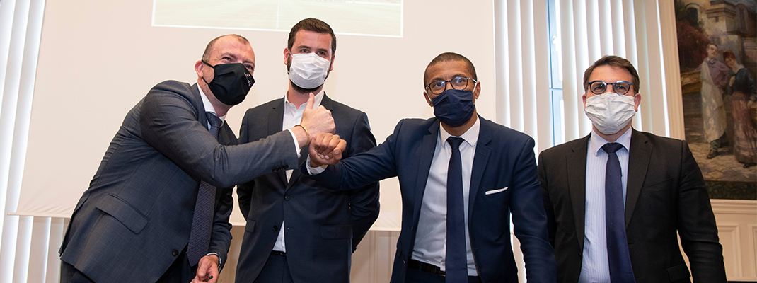 Photo : Yoann CHOIN-JOUBERT, P-DG du groupe REALITES, Karim BOUAMRANE, Maire de Saint-Ouen-sur-Seine, Geoffroy BOULARD, Maire du 17e arrondissement de Paris et Vice Président de la Métropole du Grand Paris, Pierre VIGNALOU, Notaire associé de l’étude « A contrario »