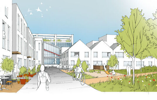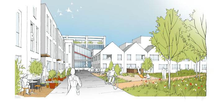 Signe d’une exigence environnementale affirmée, l’ancien bâtiment QUELLE, d’une superficie de 50 000 m² environ, sera réhabilité et converti pour recevoir une partie de ces nouveaux usages. Une option qui permet d’éviter 7 800 rotations de camions de déblais et l’émission de 6 200 tonnes de CO2. Dans le même esprit, le projet prévoit la conservation du patrimoine arboré présent sur un parc ouvert au public, et l’expérimentation de la construction d’une partie des bâtiments en matériaux biosourcés.